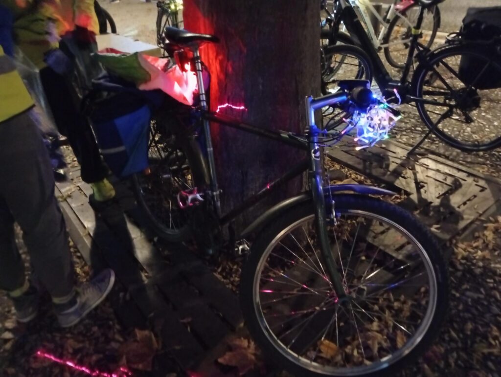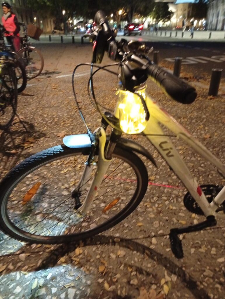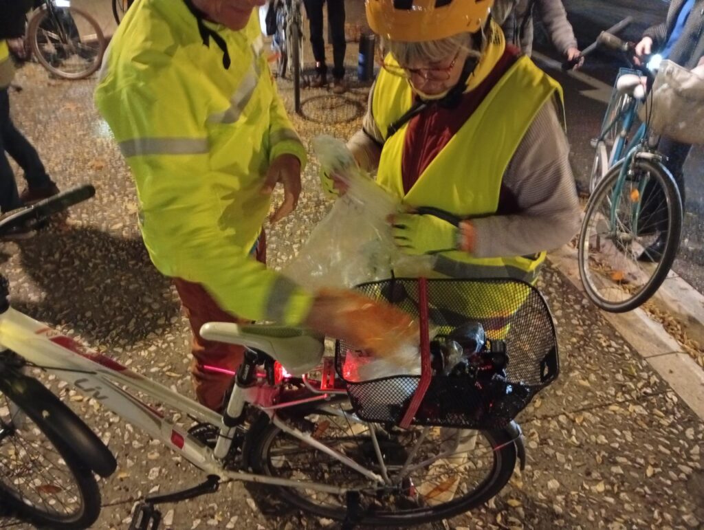 Notre action s’est traduite par une balade à vélo d’une vingtaine de cyclistes en distribuant des kits d’éclairages grâce aux dons de Vélocistes et des gilets de vélo avec la participation de la Préfecture afin le mieux vu par les autres usagers de la route (sécurité routière). Il faut être bien vu !!!