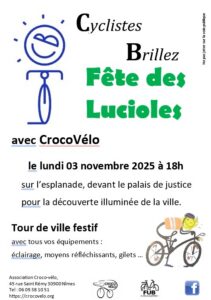 Crocovélo organise un petit tour de ville pour la fête des lucioles ! Départ 18h lundi 3 Novembre sur l’Esplanade devant le palais de justice de Nimes à 18h.