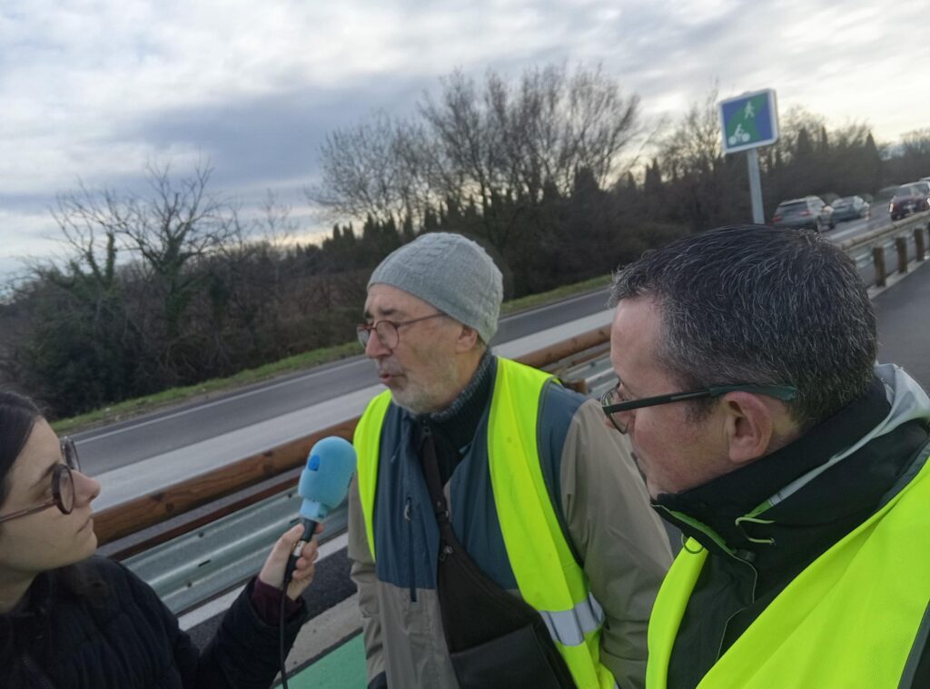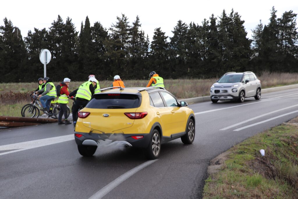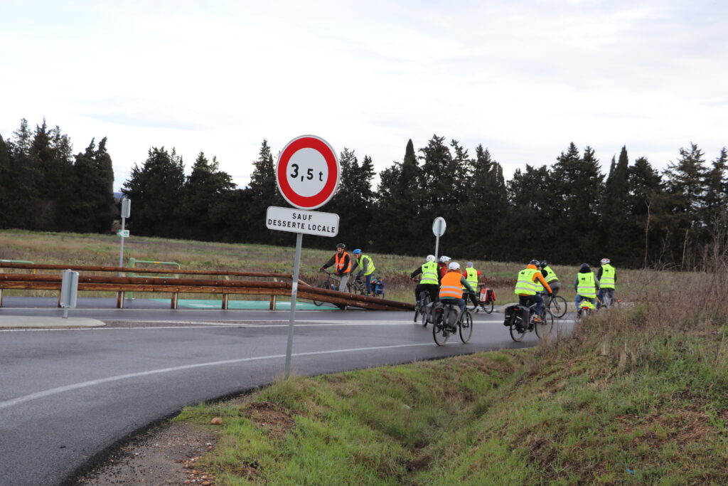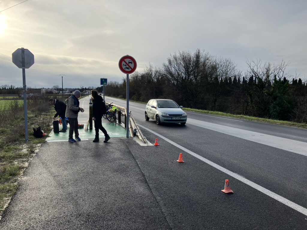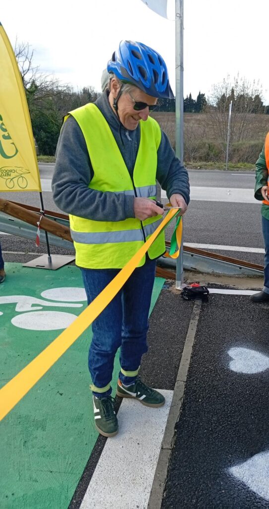Oui Mesdames et Messieurs, aujourd’hui, c’est avec une immense émotion que nous inaugurons ce quart de piste, fruit d’une coordination sans faille entre toutes les collectivités : agglo, communes, département, et qui a pu voir le jour grâce au soutien financier de la région et sous la vigilance des services de l’état, garants de la sécurité des citoyens. Aussi nous appelons ces mêmes collectivités à poursuivre leur œuvre majeure, et pour leur faire preuve du soutien indéfectible des citoyens, nous, cyclistes et usagers de la route avons décidé de les aider et commencer dès maintenant à dessiner la piste qui permettra d’assurer un futur meilleur aux cyclistes de toutes les Costières.