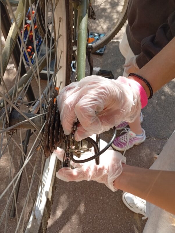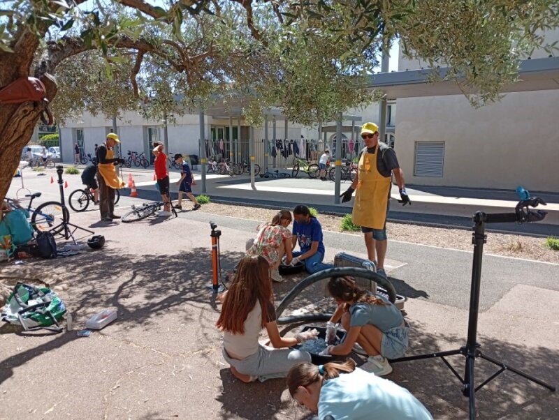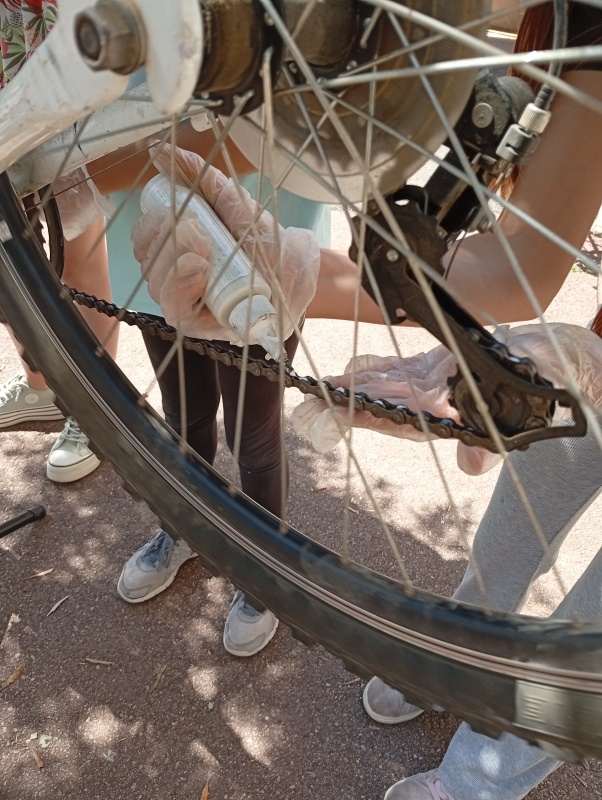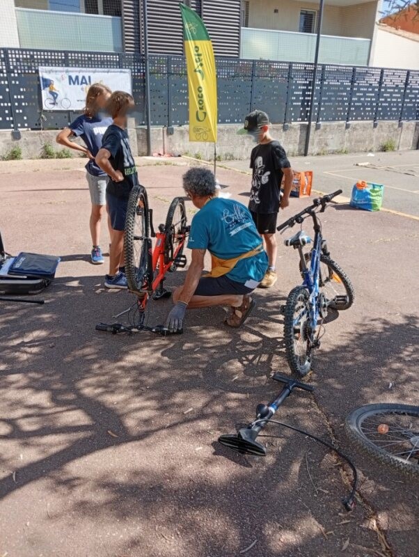 Les 4 Crocos présents se sont occupés d’animer des ateliers avec plusieurs objectifs pédagogiques : vérification de la pression des vélos, réglage de la selle, vérification des freins, apprendre à remettre une chaîne déraillée, contrôler le passage des vitesses, lubrifier une chaîne de vélo et apprendre à repérer une crevaison sur une chambre à air.