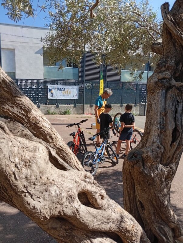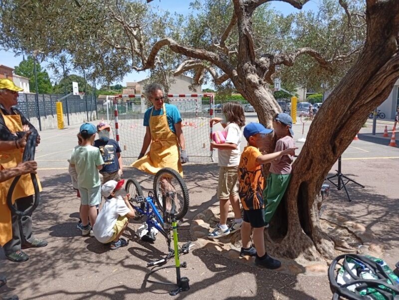 A la récréation, des élèves de CP/CE1 de l’école sont venus poser des questions pour leurs biclous. La demande est très forte pour ces péquélets à 2 roues… Sous l’olivier, une très belle journée de Mai à Vélo certainement à reconduire !