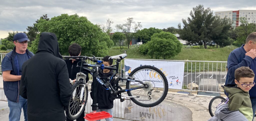 L’équipe des 5 Crocos leur a apporté de l’aide et des conseils pour être plus autonome en cas de problème mécanique. Ce fut aussi l’occasion de remettre en état le parc vélo de l’Association.